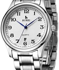 BUREI Hommes Femmes Quartz Montre Date Affichage Blanc/Noir Cadran avec Argent Acier Inoxydable Bande