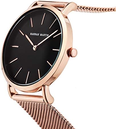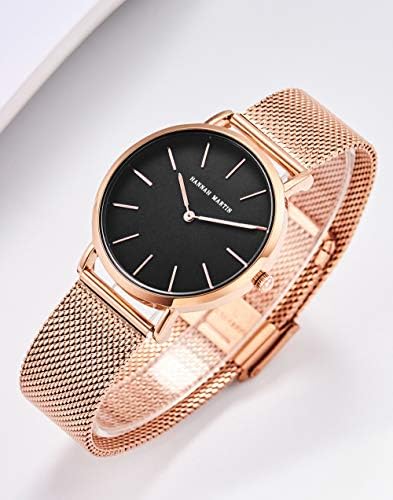 HANNAH MARTIN Très Mince Montre pour Femme Quartz Analogique Étanche Acier Inoxydable (Surface Noir, Ceinture Doré Rose)